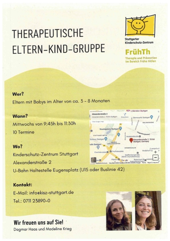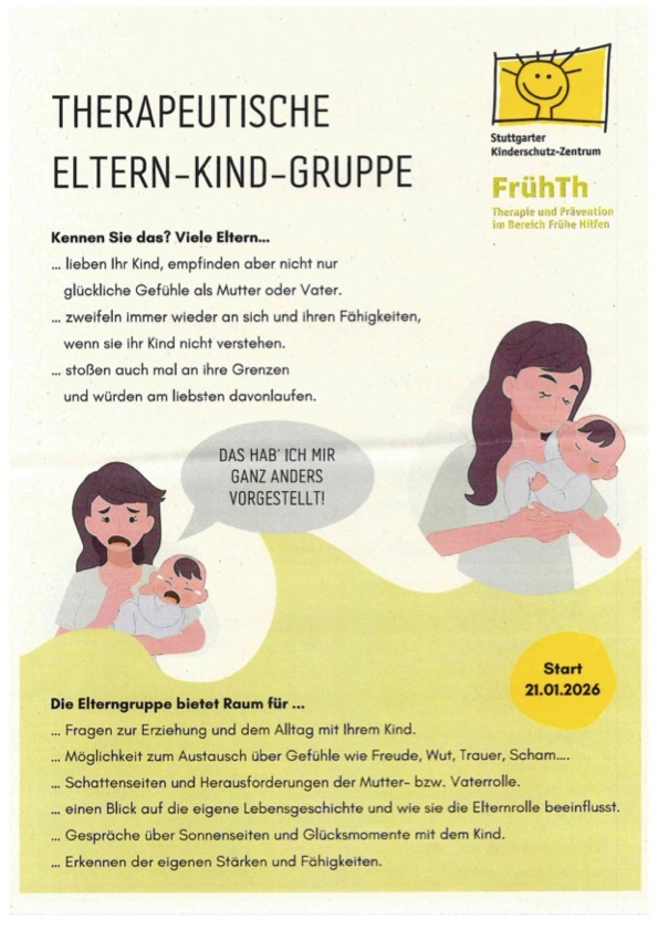 Ab dem 21. Januar 2026 beginnt eine neue therapeutische Eltern-Kind-Gruppe des Kinderschutzzentrums Stuttgart. Sie findet 10 Mal Mittwochs ab 9:45 Uhr in der Alexanderstr. 2 statt und richtet sich an Altern mit Babys im Alter von 3-8 Monaten.
