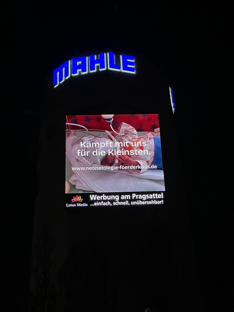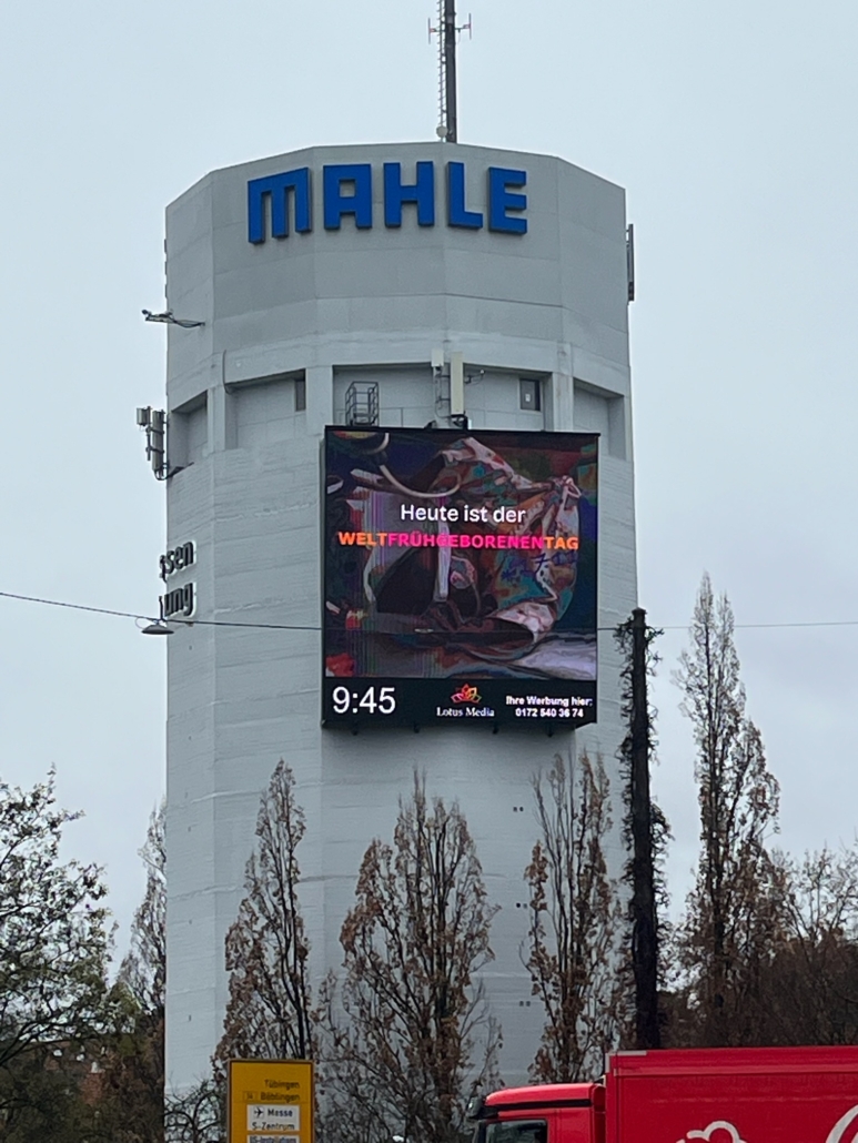 Ein weiteres Leuchtelement, das in diesem Jahr auf den Welt-Frühgeborenen-Tag aufmerksam gemacht hat, strahlte den gesamten Tag über am Stuttgarter Pragsattel. die große Werbetafel am Hochbunker, die von der Firma Lotus Media betrieben wird, zeigte einen Clip mit einem Frühchen und der Aufschrift “Kämpft mit uns für die Kleinsten.” Ein herzliches Dankeschön an Lotus Media, die uns diese Anzeigenschaltung zur Verfügung gestellt haben.