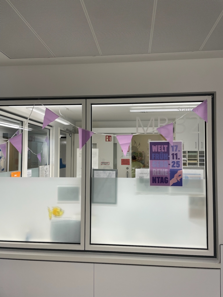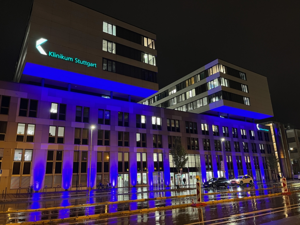 Am Welt-Frühgeborenen-Tag werden auf der ganzen Welt markante Wahrzeichen wie Schlösser oder Museen in der Farbe purpur angestrahlt, um auf die besondere Startsituation der Allerkleinsten hinzuweisen. In diesem Jahr konnten wir die Beleuchtungsaktion, die auch unter „Purple for Preemies“ oder „Light it up purple“ bekannt ist, direkt im Klinikum Stuttgart umsetzen! Dank der großartigen Unterstützung von mu&te Productions, ansässig am Hölderlinplatz, sowie music express Veranstaltungstechnik erstrahlte nicht nur das Foyer des Olgahospitals mit unserem Infostand in lila, sondern auch die ganze Front des Neubaus des Klinikum Stuttgart! Wir sind beeindruckt von der perfekten, professionellen und unkomplizierten Umsetzung dieser Aktion und können uns nur von Herzen bedanken!