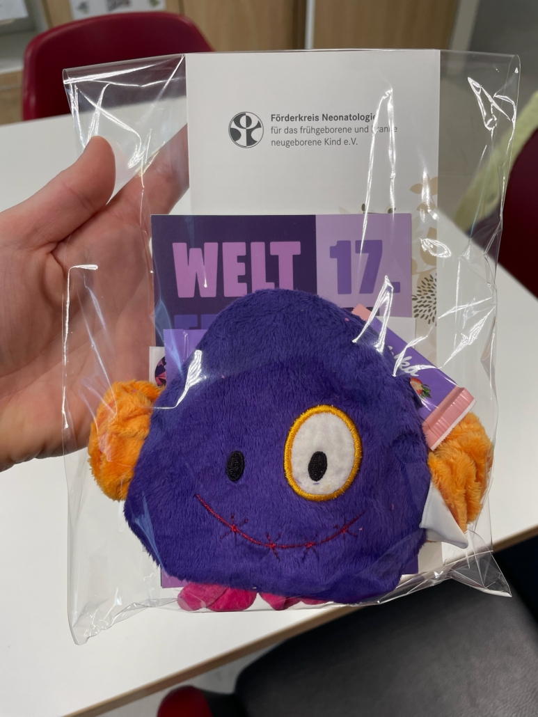 Den Eltern, die aktuell ihre Tage, Wochen und Monate aktuell auf unseren Stationen verbringen, haben wir zur Feier des Tages ein kleines Geschenk gemacht: Die Eltern erhielten prall gefüllte Tüten mit einem Wärmekissen, gespendet von Minela Fisic, kleine Süßigkeiten, Flyer und eine schöne Karte zum Welt-Frühgeborenen-Tag, gestaltet von unserer Maike Schamotzki.